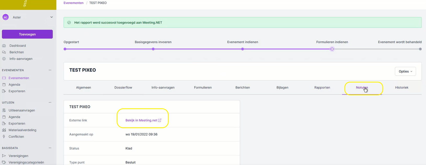 - Na het exporteren verschijnt er in het Flowlab evenementendossier een extra tab Notulen. Via deze tab kan je rechtstreeks door klikken en het dossier bekijken in Meeting.net.