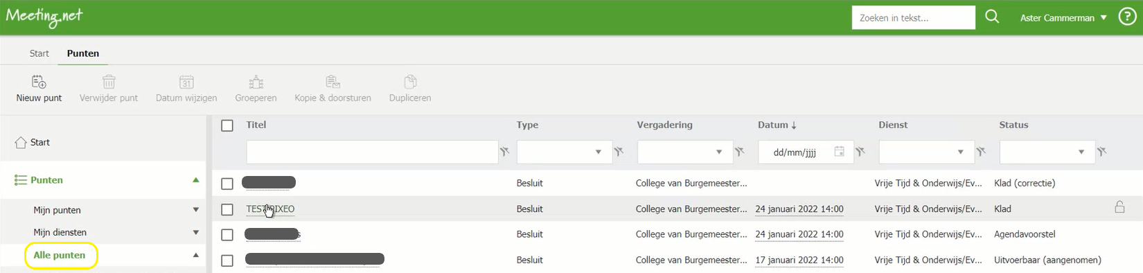 - Wanneer je het dossier wil gaan raadplegen in Meeting.net kan je dus via de Notulen tab in het Flowlab dossier gaan of je kan gewoon aanloggen in Meeting.net en via ‘Alle punten’ het dossier opsnorren.