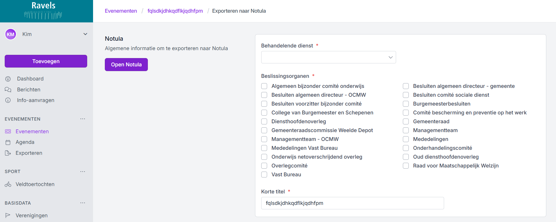 Je kan per evenementaanvraag meerdere exports doen naar Notula. Na de eerste export, kies je via Opties voor Exporteren naar Notula voor een volgende export.