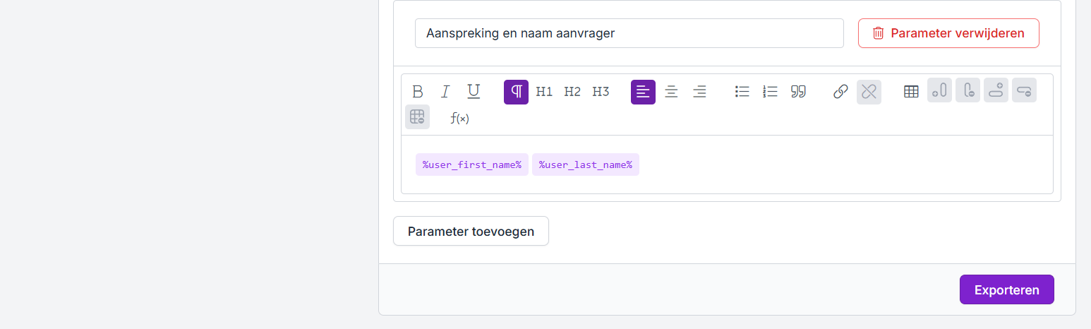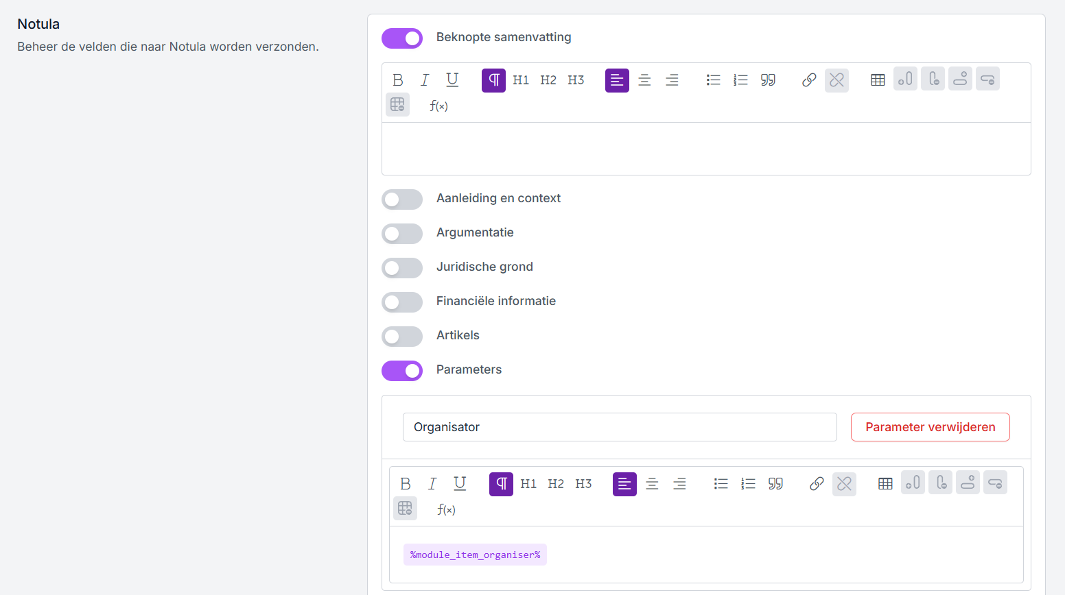 - Parameters - hier kan je meerdere parameters toevoegen wanneer je in Notula met sjablonen werkt.