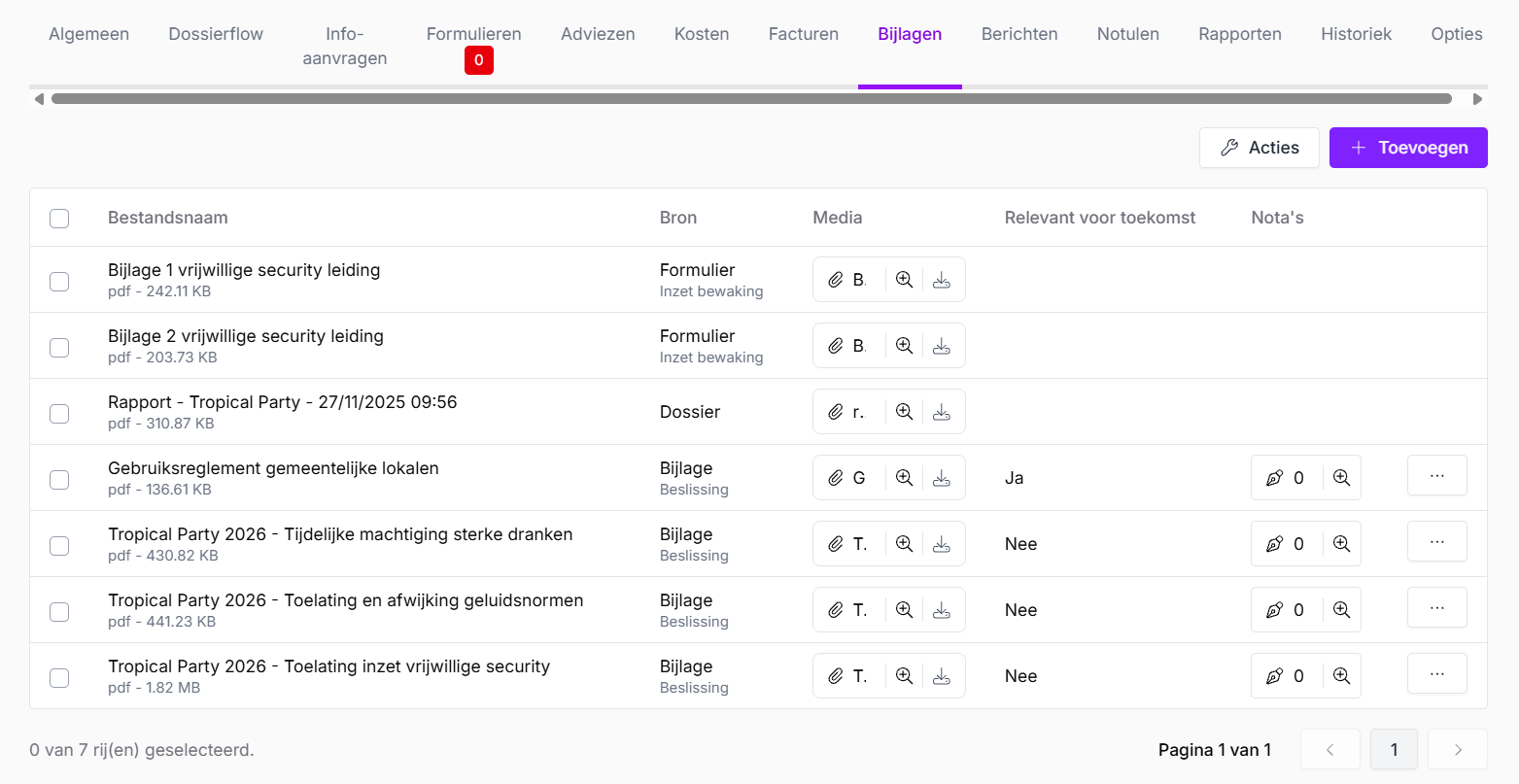 - Bijlagen - eventuele bijlagen van het dossier worden hier vermeld en de nodige bijlagen om mee te sturen naar Notula kan je aanvinken.