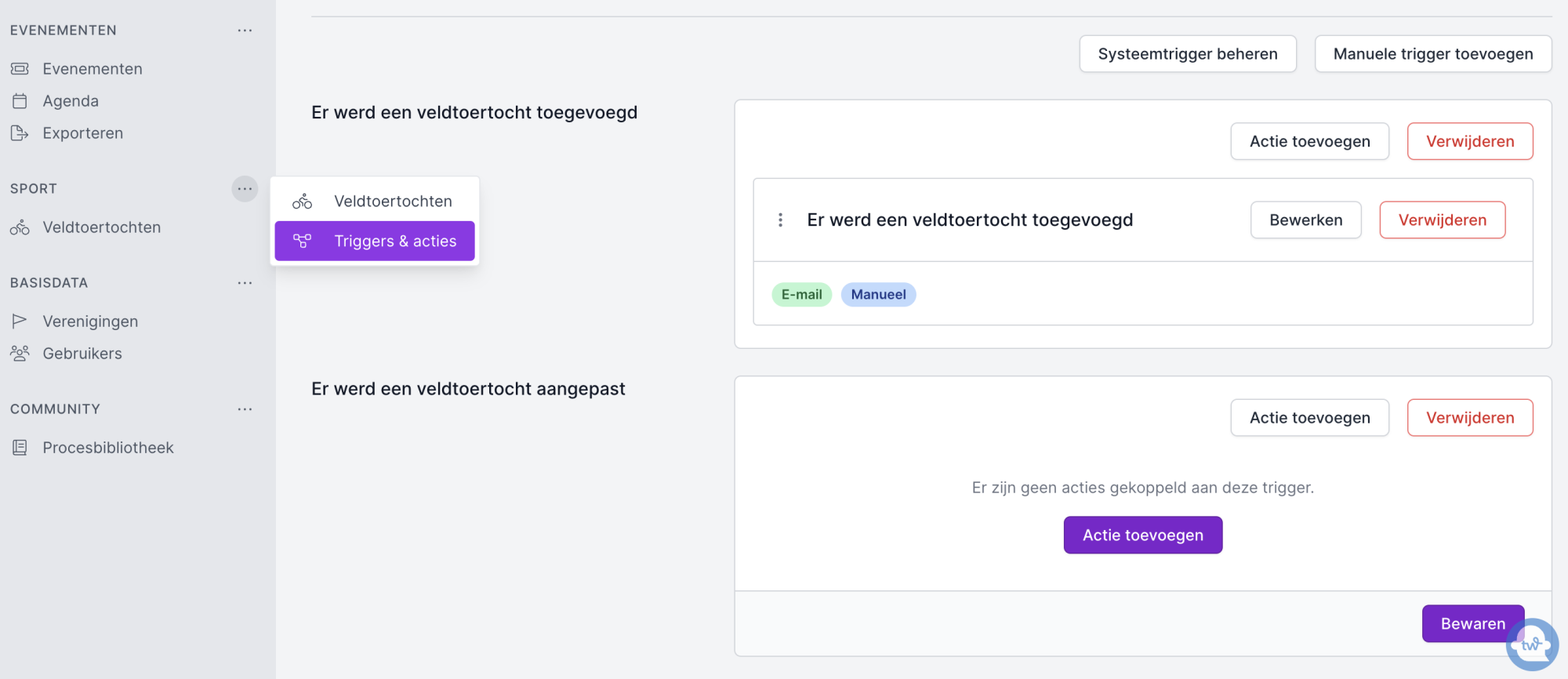 In de linkernavigatiekolom, naast de sectie 'Sport', vind je drie bolletjes waarmee je triggers en acties kunt toevoegen. Binnen deze module zijn de systeemtriggers 'Veldtoertocht toegevoegd' en 'Veldtoertocht aangepast'. Je kunt meer gedetailleerde informatie over deze functionaliteit vinden in het artikel triggers en acties.
