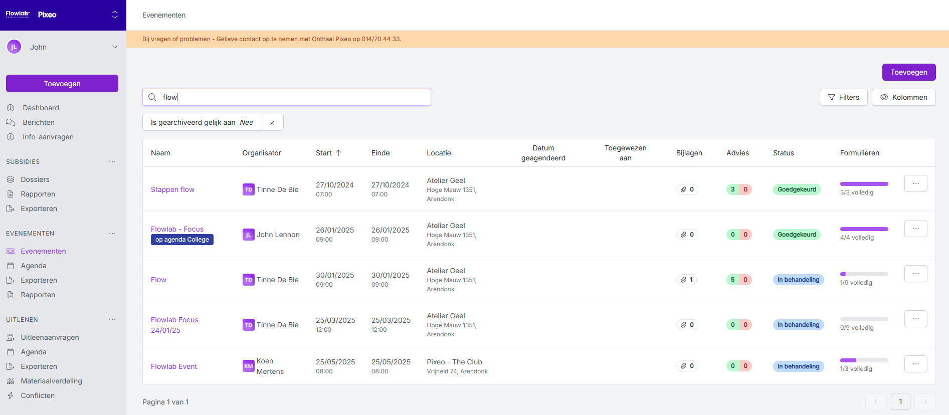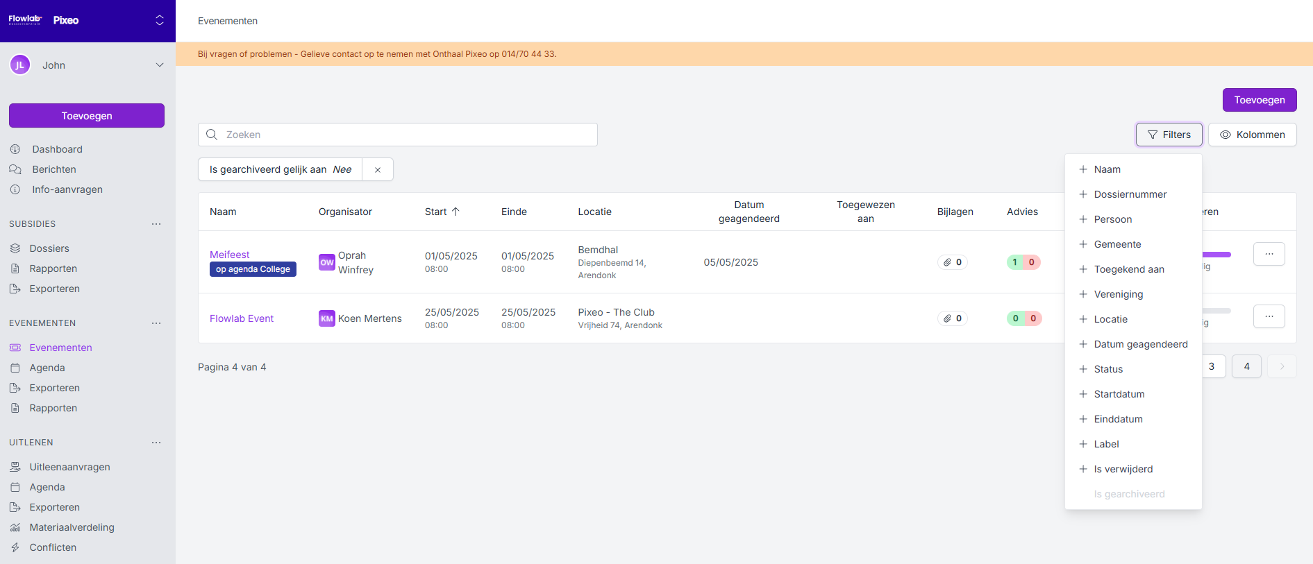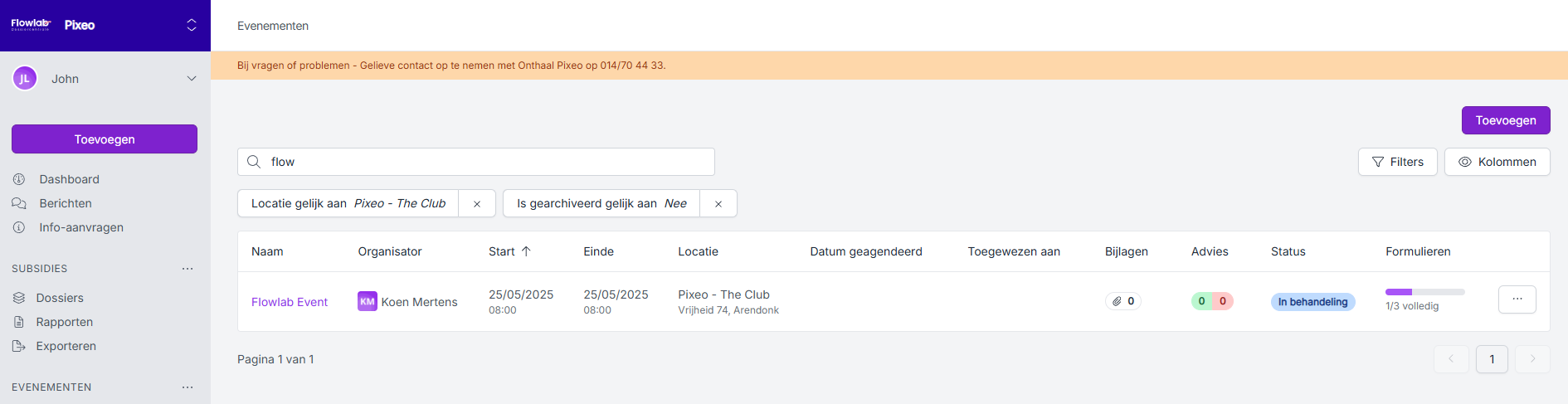In het overzichtsscherm evenementen onder Evenementen in de linkernavigatie zie je een overzicht van alle evenementsaanvragen.