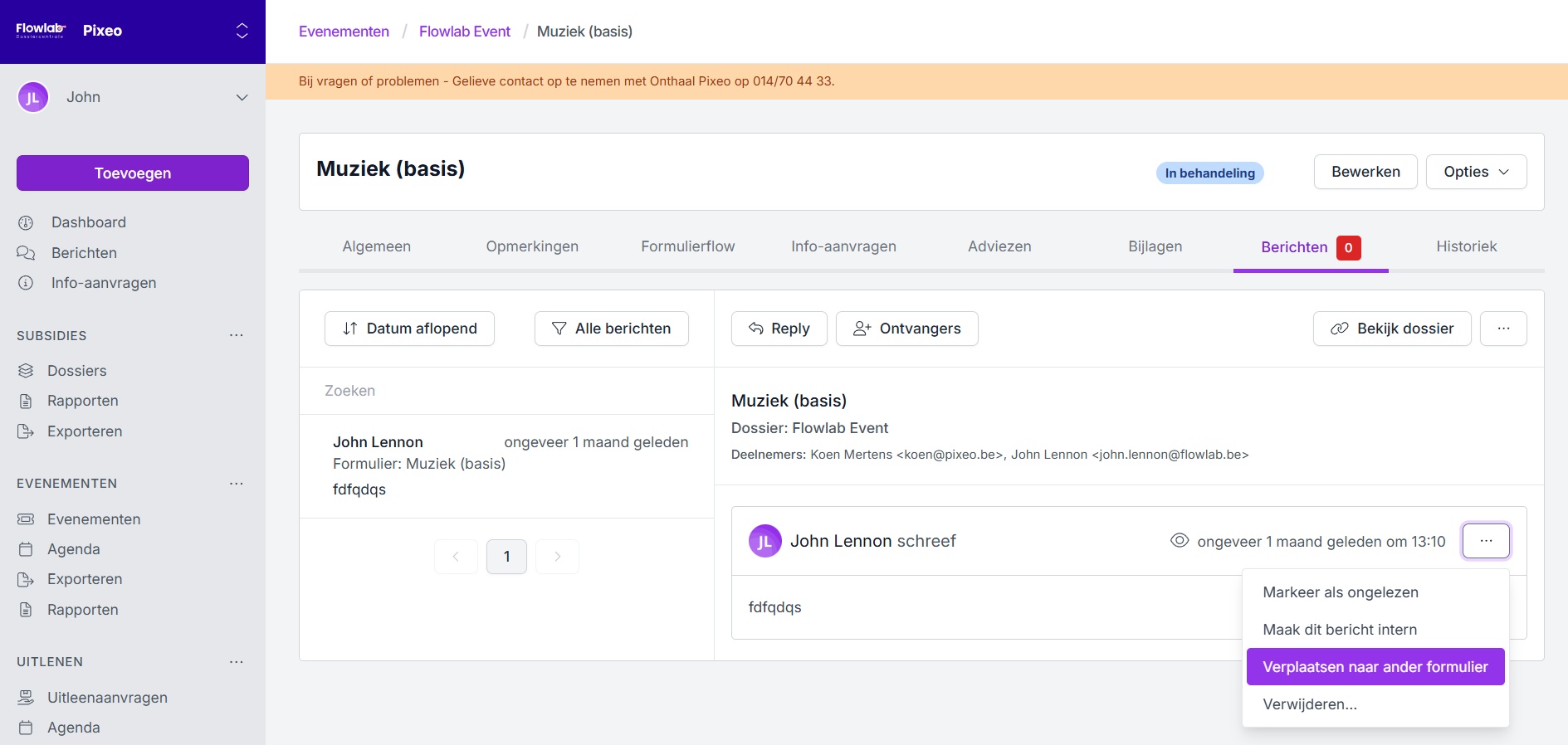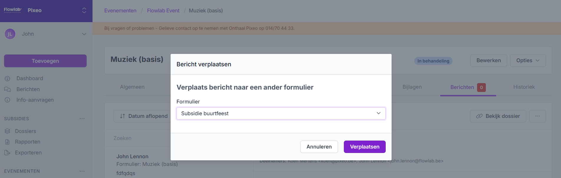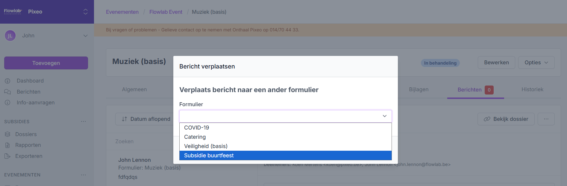 Bij een evenementaanvraag kan je berichten verplaatsen tussen formulieren.