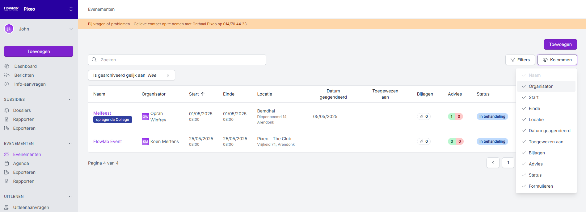 Het overzicht van dossiers van evenementsaanvragen vind je terug onder Evenementen bij de module Evenementen. Voor de dossierbeheerder van de module evenementen is dit de voornaamste werkpagina, alle aanvragen staan hier verzameld.