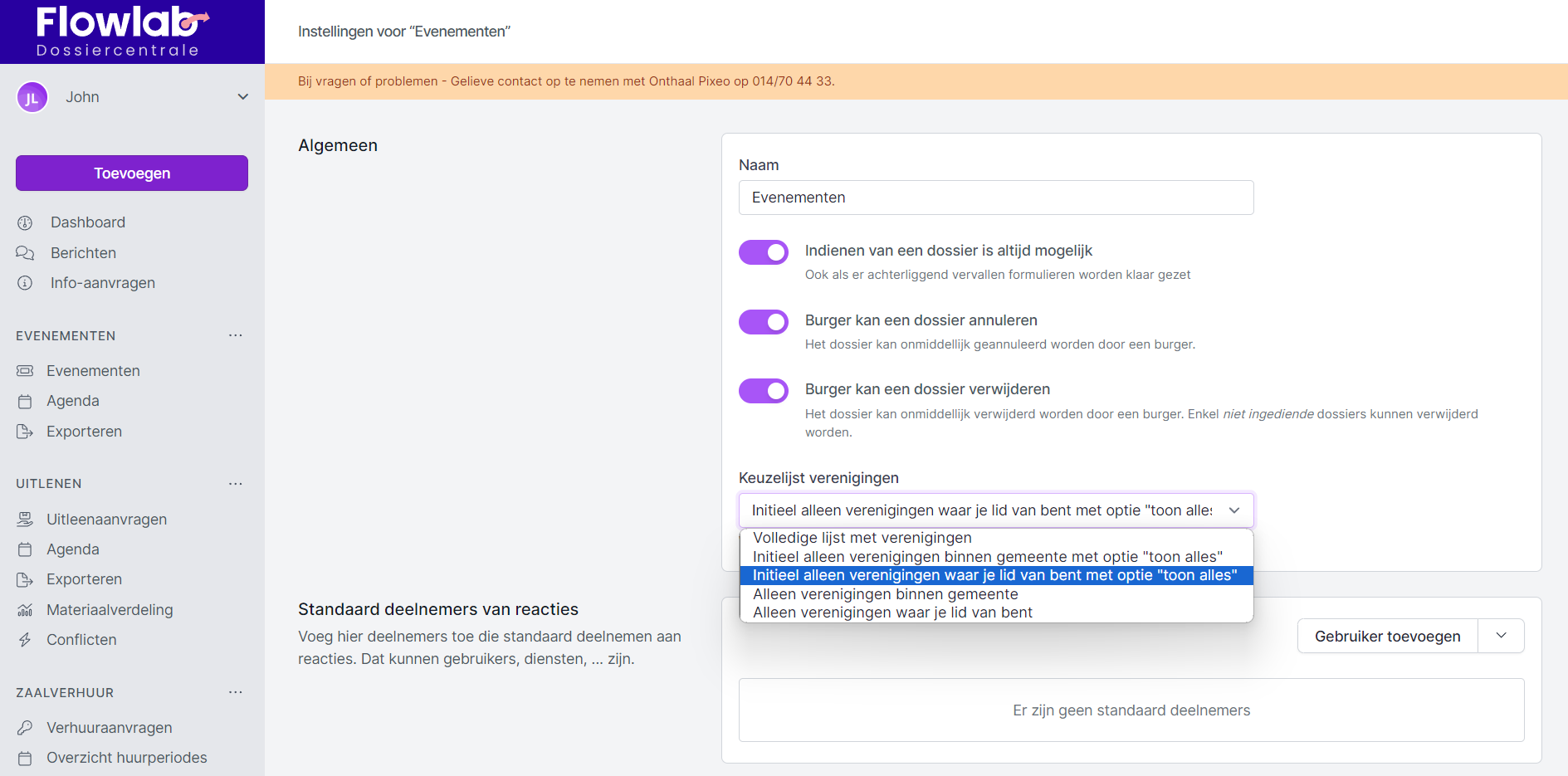 - Keuzelijst verenigingen:Hier bepaal je welke keuzelijst de aanvrager standaard ziet wanneer hij een evenement aanvraagt voor een vereniging.