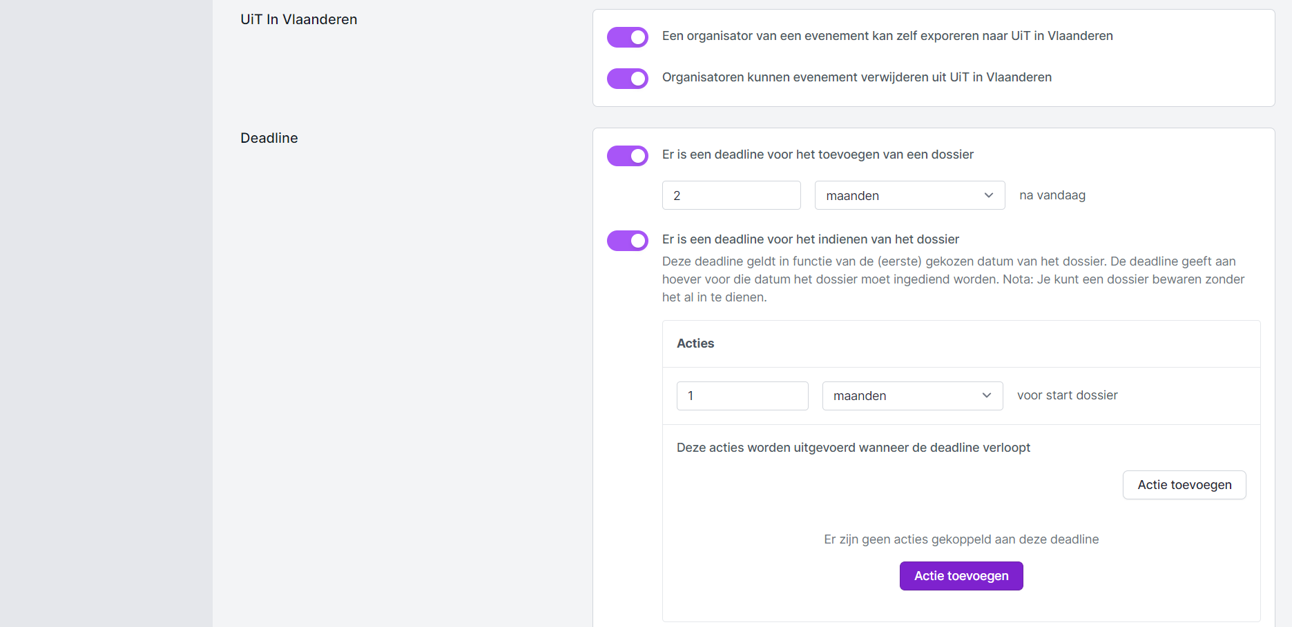 - Deadline voor het indienen van een dossier: Deze termijn bepaalt wanneer het dossier ten laatste ingediend moet zijn om verwerkt en goedgekeurd te kunnen worden. Het dossier moet ten laatste x-tijd voor het evenement ingediend zijn.