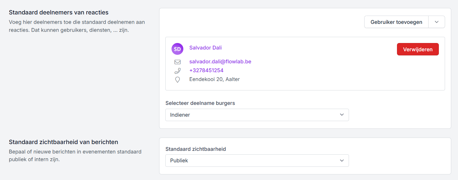 - Selecteer deelname burgers: hier kan je bepalen of enkel de indiener of alle leden van een vereniging deelnemen bij het versturen van berichten op dossierniveau.