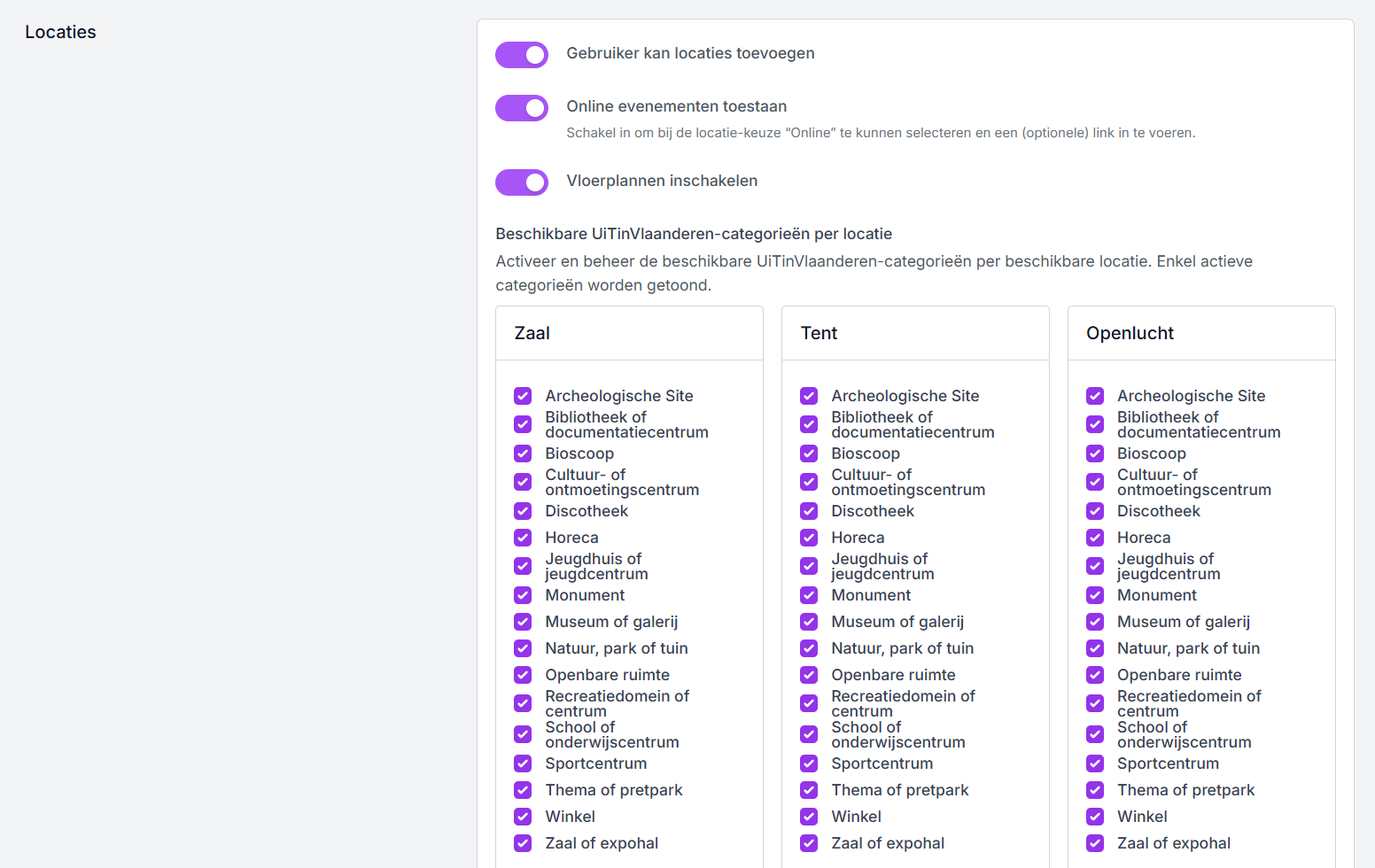 - Beschikbare UiTinVlaanderen-categorieën per locatie: standaard worden deze allen aangevinkt, enkel actieve categorieën (waaraan een locatie werd gekoppeld) worden getoond.