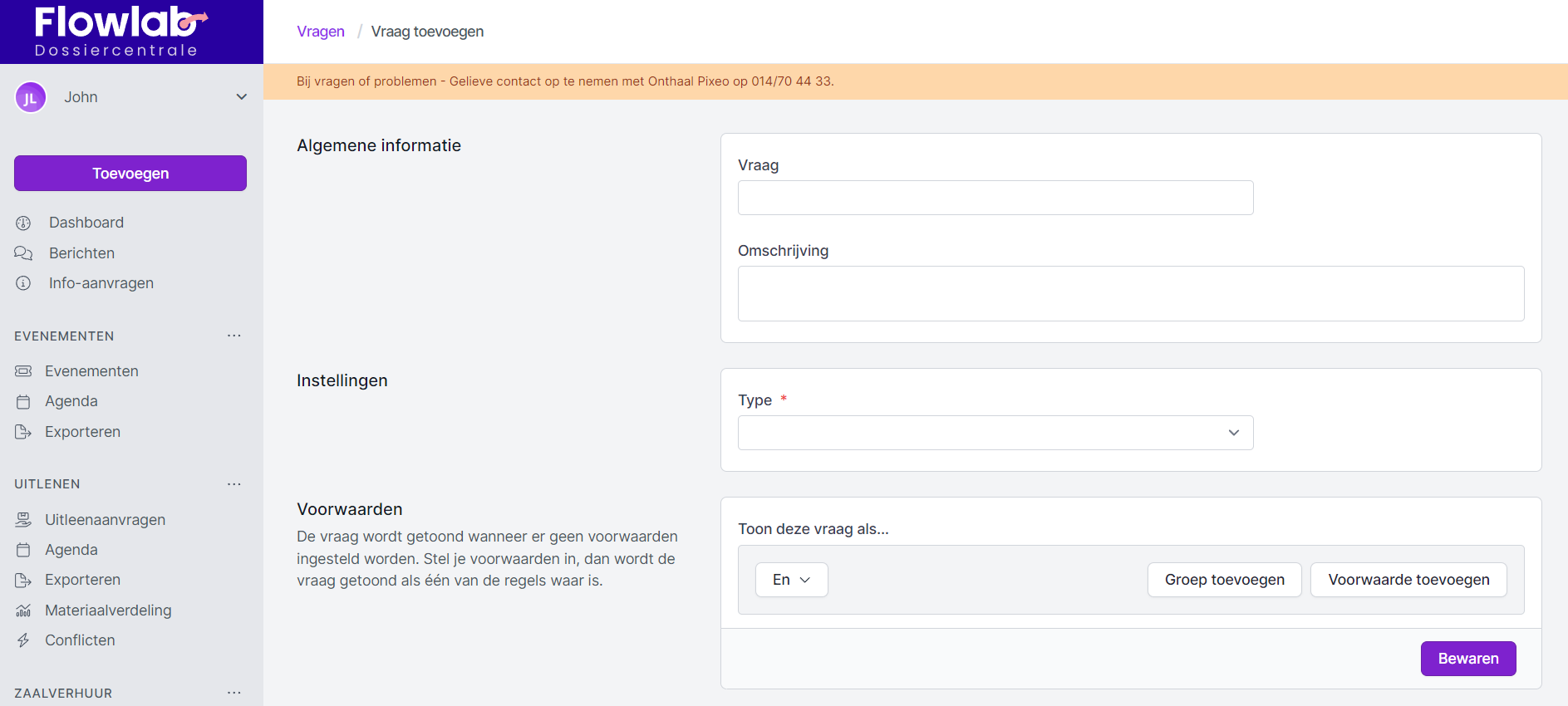 - Voorwaarden: Hiermee kan je instellen wanneer deze vraag getoond wordt. Deze optie wordt gebruikt om vervolgvragen te stellen. (Dit wordt bij vragen voor Uitleen meestal niet toegepast.)