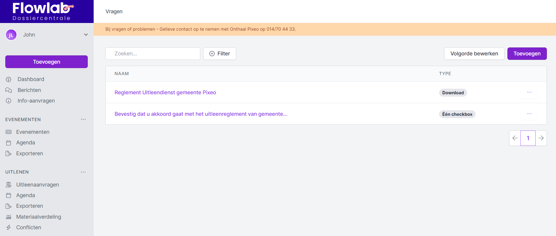 Je kan vragen toevoegen aan de dossierflow van een uitleenaanvraag om extra vragen te stellen aan de aanvrager of om het uitleenreglement ter beschikking te stellen en hiervoor akkoord te vragen.