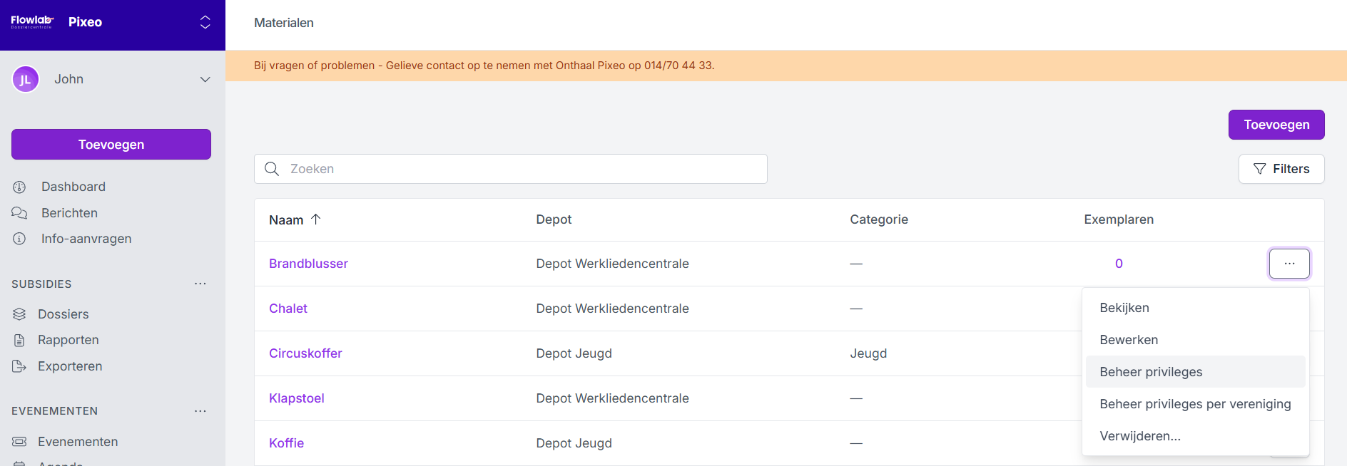 Op de pagina Materialen onder de module Uitlenen staat een overzicht van het ingegeven materiaal. Vanaf deze pagina kan je de informatie van de verschillende materialen bewerken en kan je materialen verwijderen.