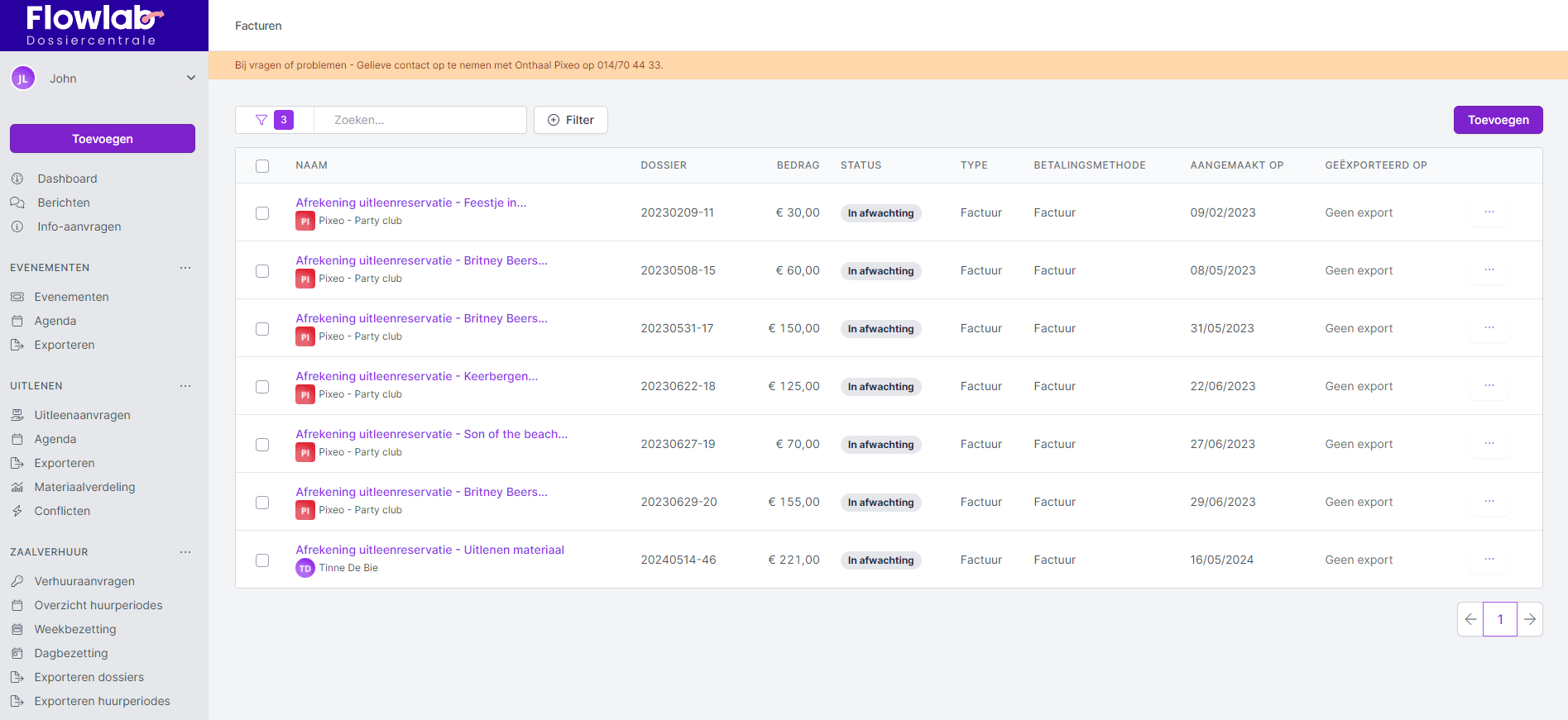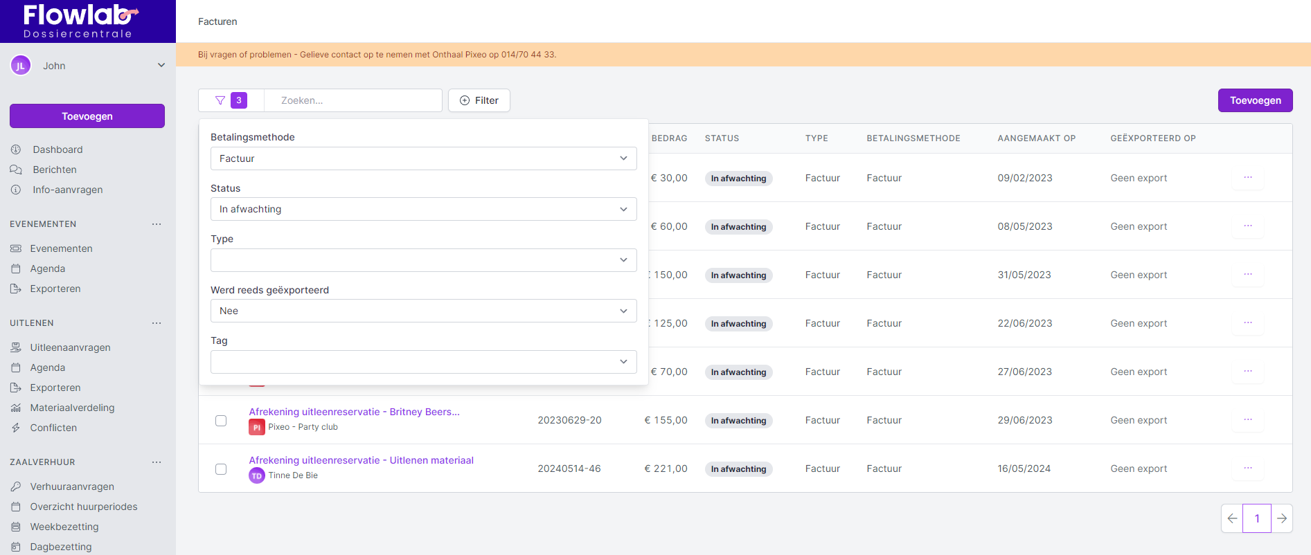 Via de pagina Facturen onder de module Uitlenen krijg je een overzicht van alle aangemaakte facturen voor de uitleenaanvragen. Via deze pagina kan je de facturen bekijken, verwerken, eventueel verwijderen en exporteren.