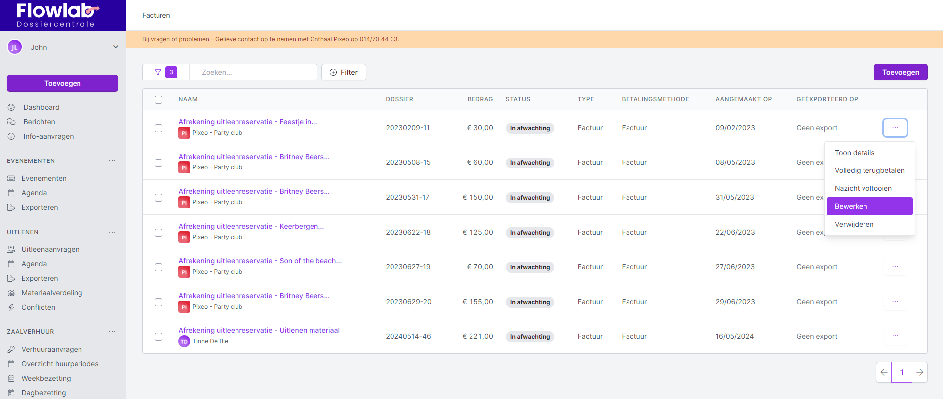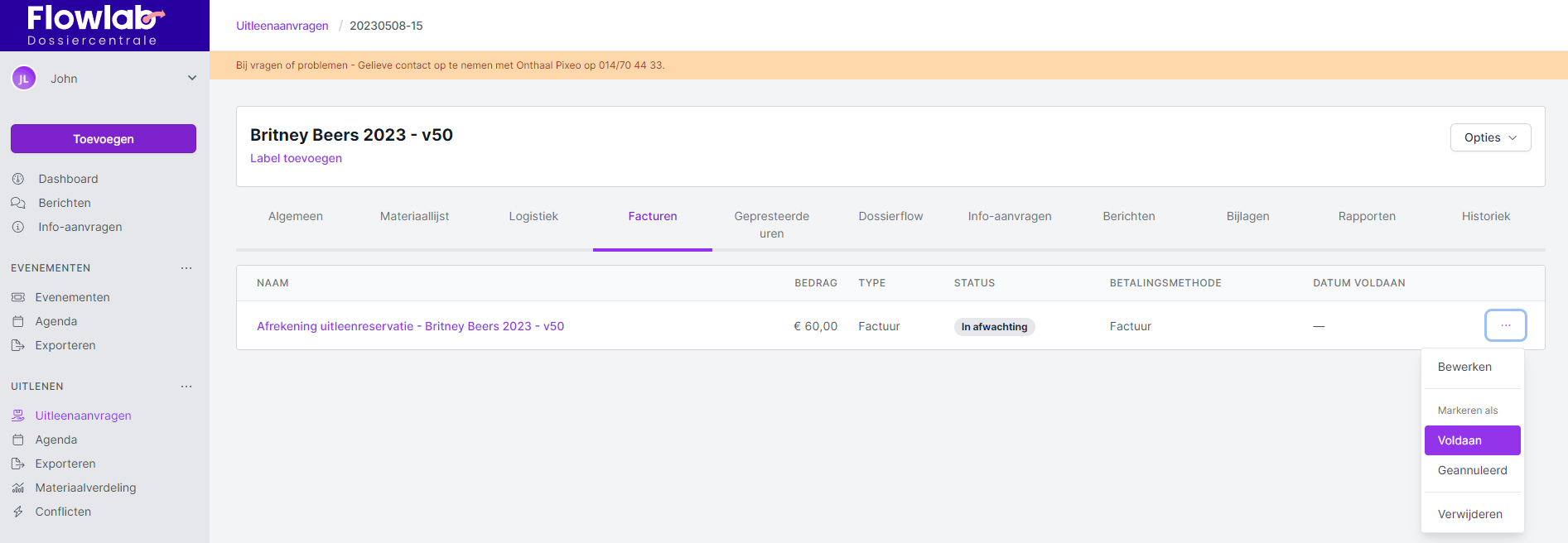 De status van een factuur bij de uitleenmodule kan je op verschillende manieren aanpassen, zowel via de uitleenaanvraag zelf, als via de pagina Facturen onder de module Uitlenen.