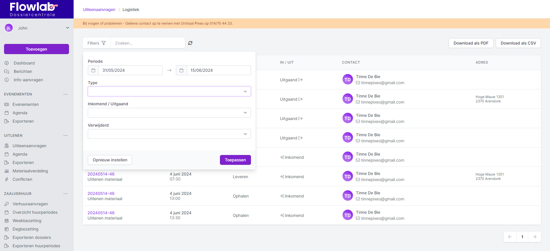 Op de pagina Logistiek onder de module Uitlenen kan je via de filter bovenaan links aanduiden voor welke periode je de logistiek wil opvolgen en voor welke type, al dan niet in combinatie met inkomend/uitgaand.