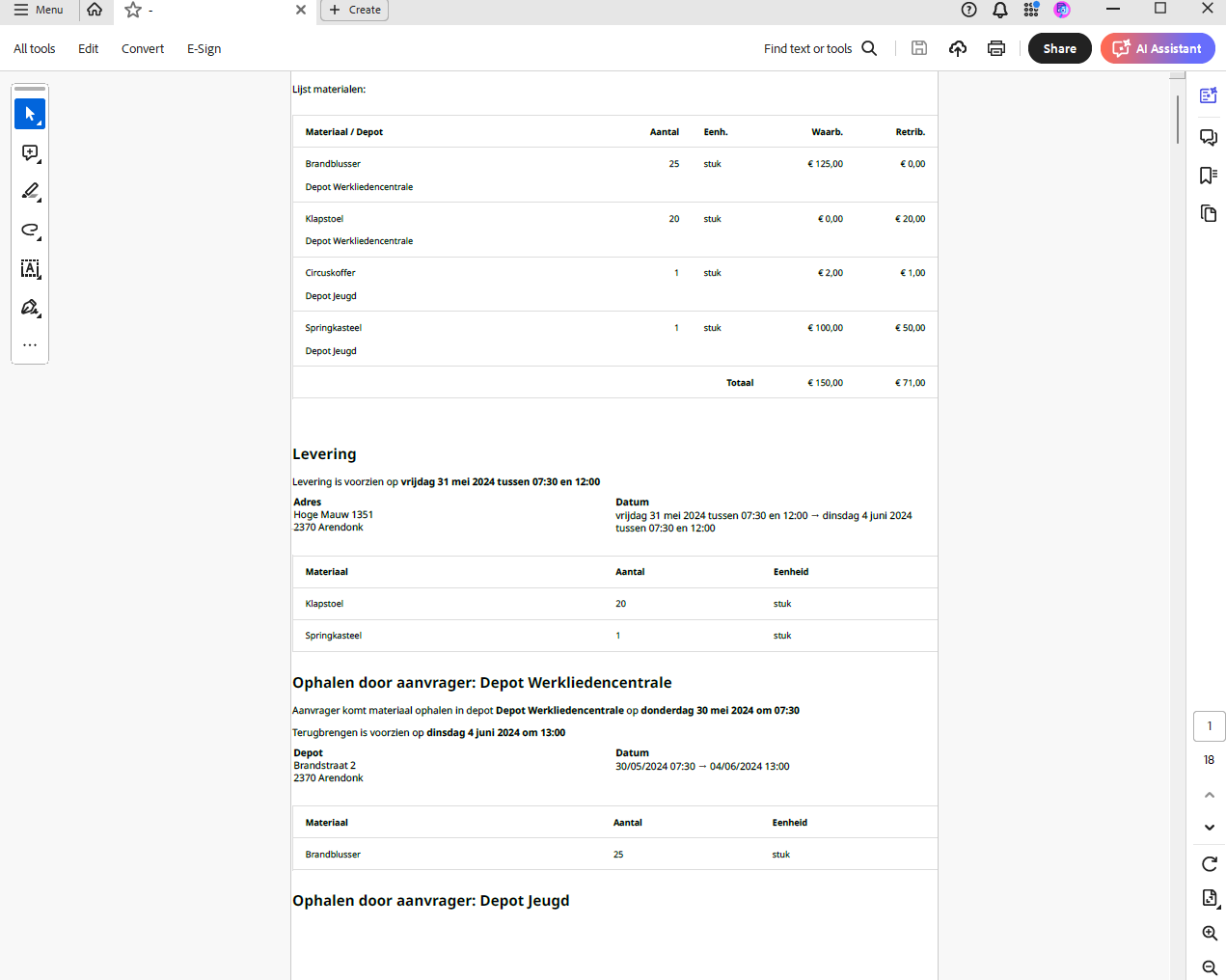 - Leveren: het materiaal dient geleverd te worden op het adres (in de laatste kolom)