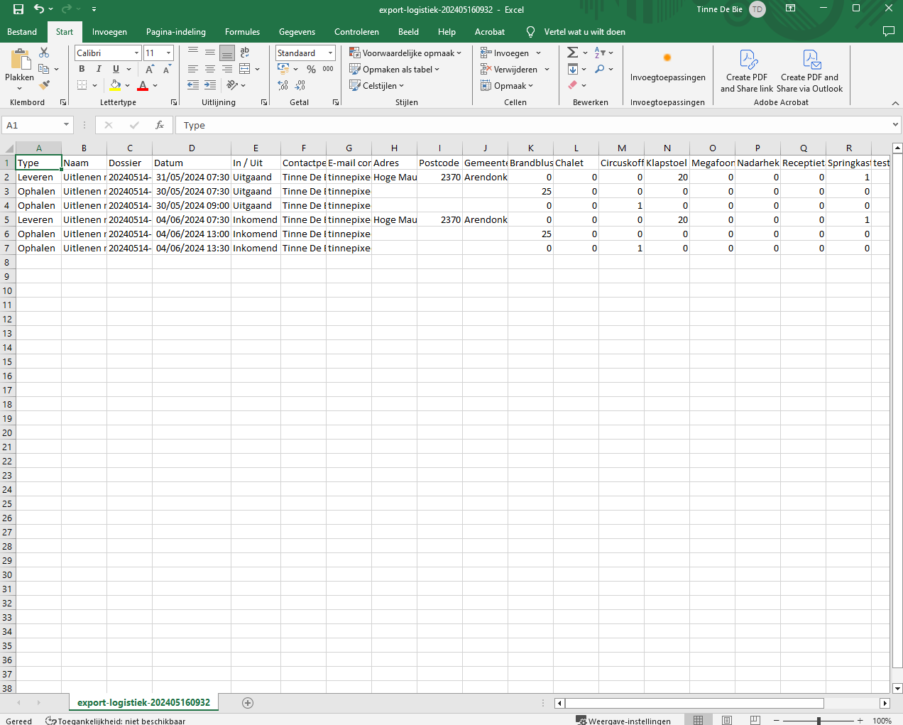 Er wordt een CSV-bestand klaargezet in de downloadmap van je pc, met daarin een overzicht van de bewegingen van de logistiek EN het betreffende materiaal. Het CSV-bestand geeft alle nodige info weer in een excel-bestand. Dit document kan je verder bewerken, afhankelijk van de eigen noden.