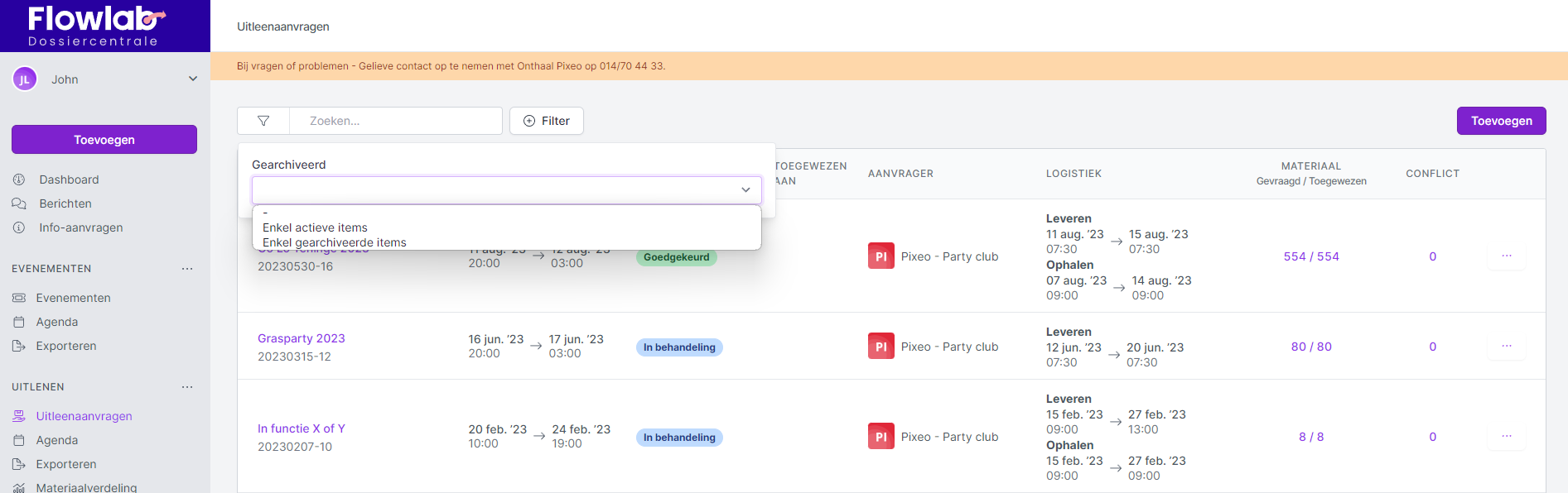 - Enkel gearchiveerde items: toon een overzicht met enkel gearchiveerde uitleenaanvragen.