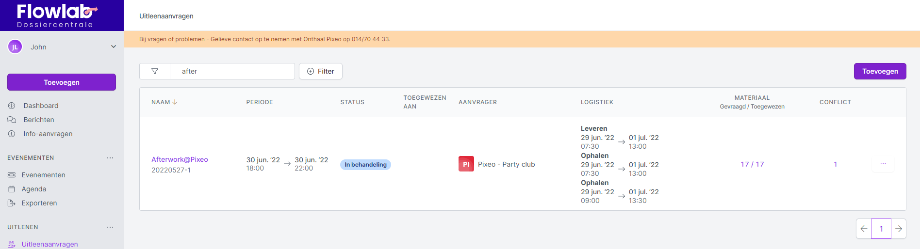 - Er wordt een lijst getoond met de uitleenaanvragen die de gezochte naam bevatten.