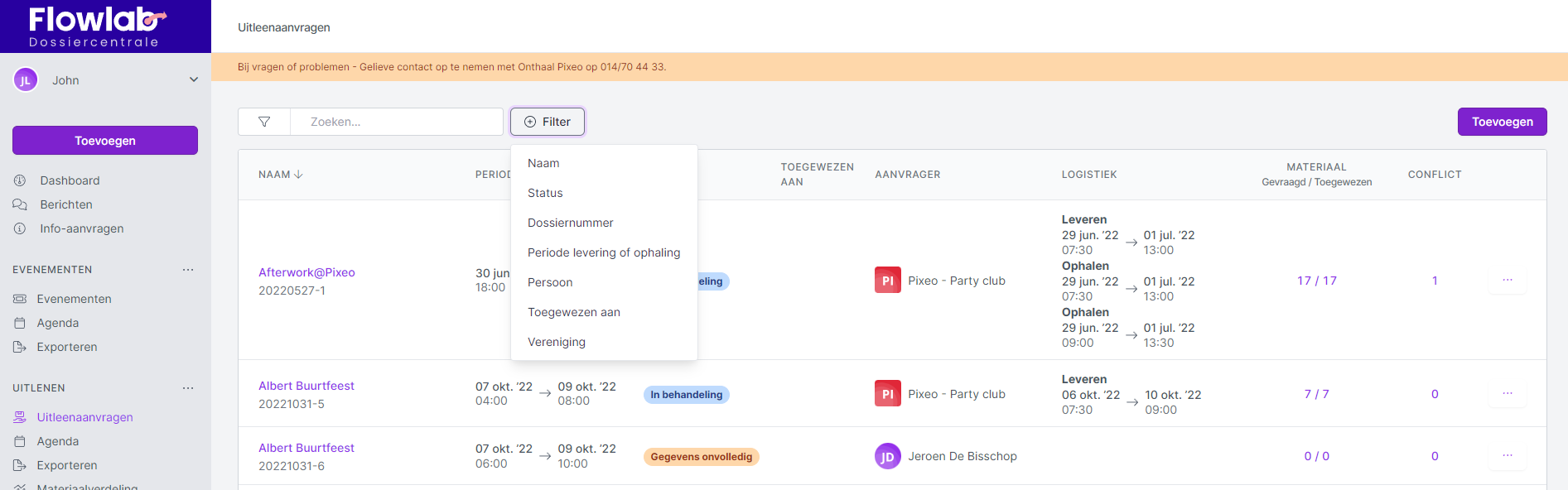 Je kan gericht een uitleenaanvraag zoeken in dit overzicht met behulp van de zoekfunctie en filterknoppen bovenaan.