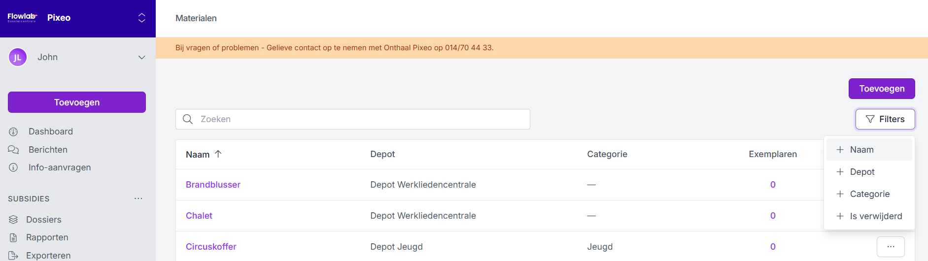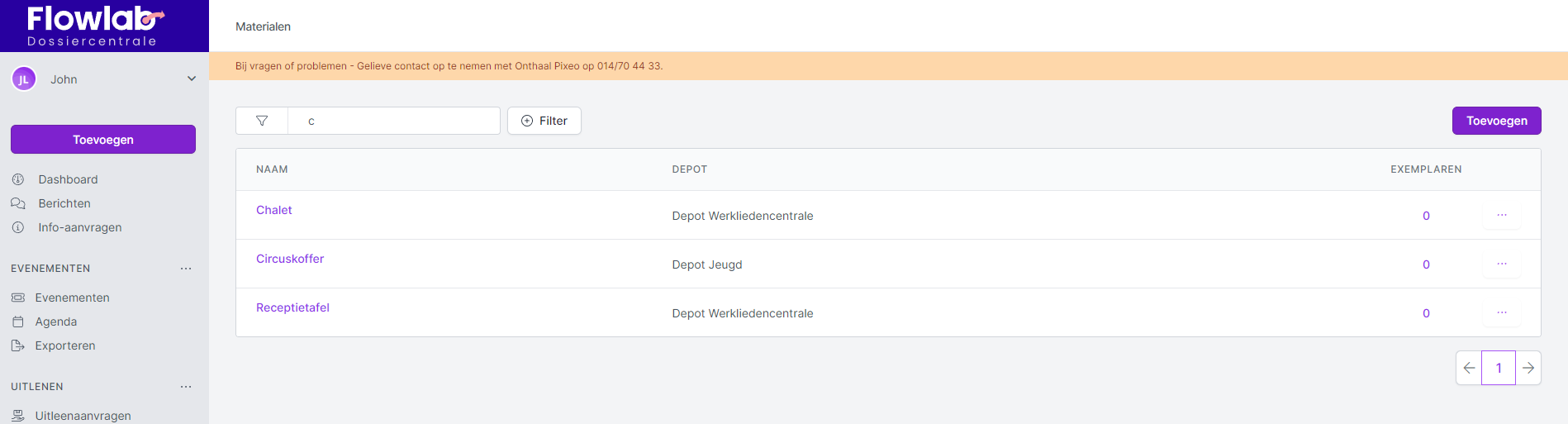 In het overzichtsscherm Materialen onder de module Uitlenen in de linkernavigatie zie je een overzicht van alle toegevoegde materialen.