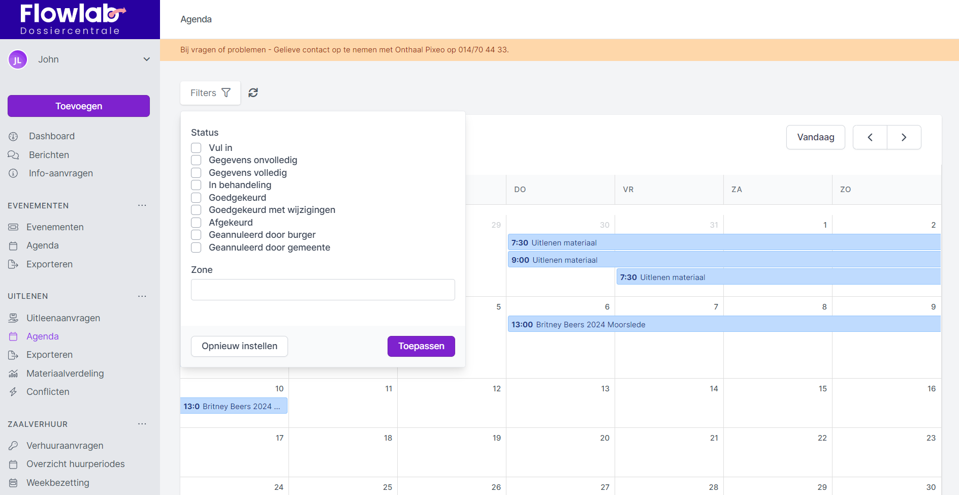 In de agenda kan je door het gebruik van de filters links bovenaan bepalen welke uitleenaanvragen je in de agenda wil zien.