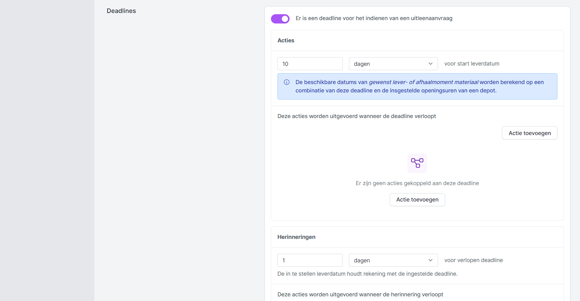 Via de instellingen onder de module Uitlenen bepaal je de deadlines voor een uitleenaanvraag.