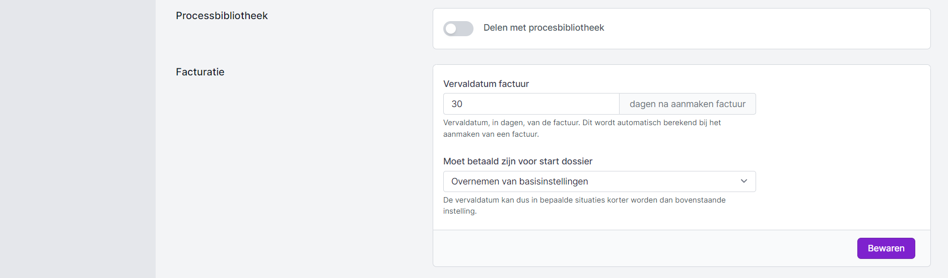 De instellingen voor facturatie kan je ook instellen bij de Basisdata. Heb je verschillende modules waarvoor verschillende instellingen qua facturatie gelden, dan kan je de basisinstellingen per module overschrijden.
