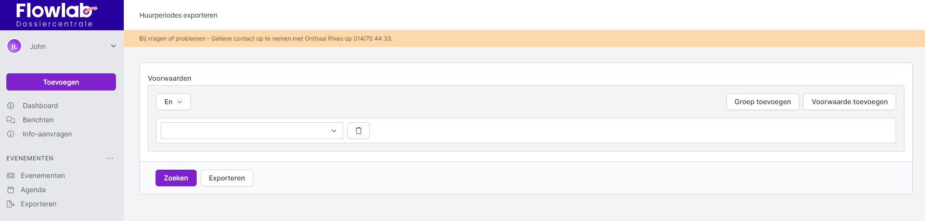 - Selecteer Exporteren huurperiodes onder de module Zaalverhuur in de linkernavigatie.