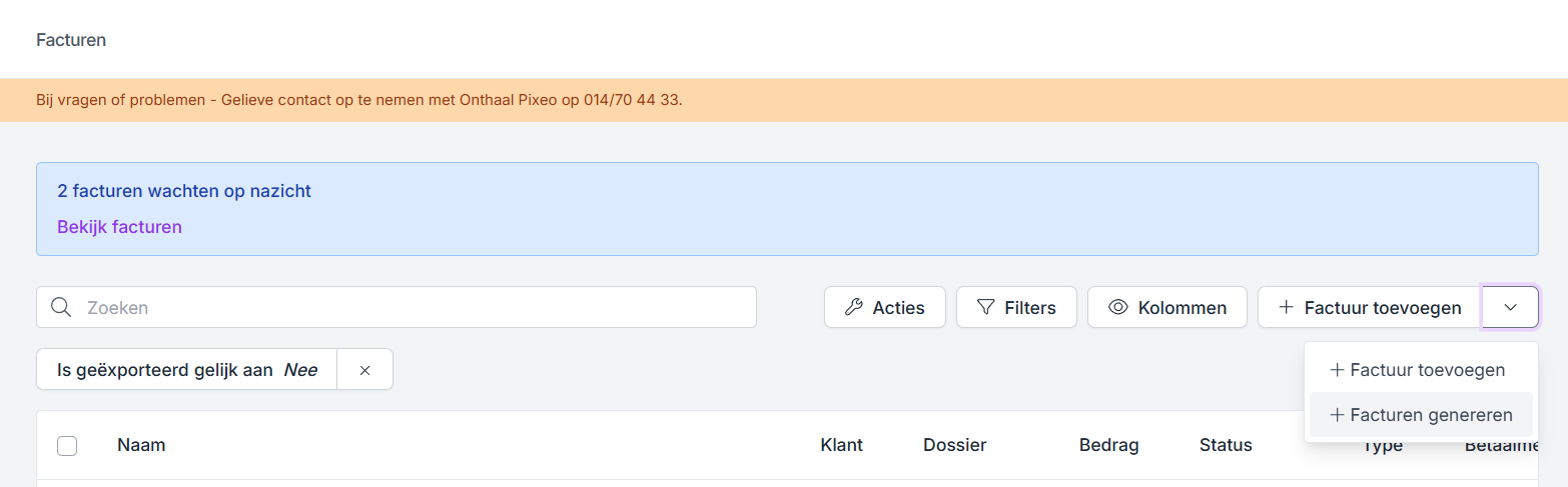 - Klik rechts bovenaan op het pijltje naast Factuur toevoegen en kies voor +Facturen genereren.