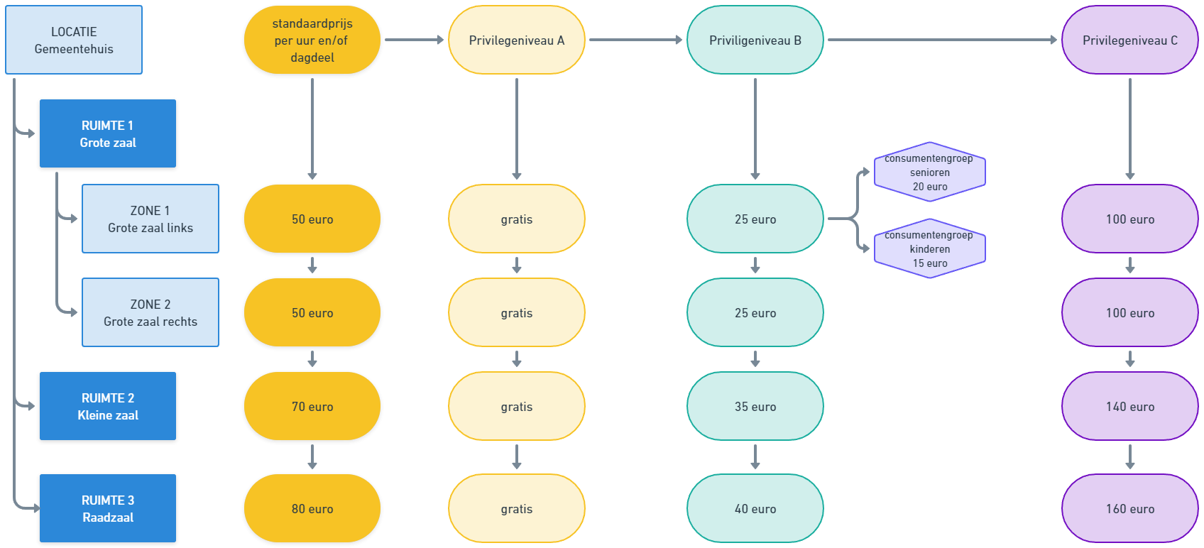 Met het gebruik van consumentengroepen kan je privilegeniveaus voor locaties nog verder onderverdelen om zo de prijs nog meer te specifiëren en/of de zichtbaarheid van een ruimte of zone te bepalen.