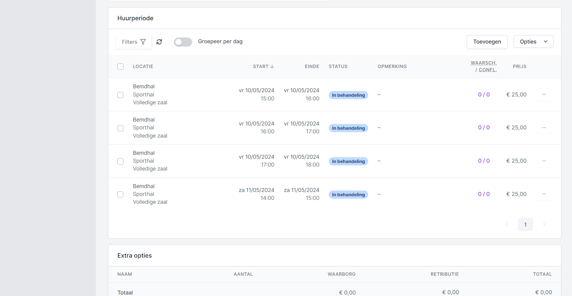 - Selecteer Opties bij de Huurperiode en kies voor Alles reserveren of voor Reserveren wat kan. Alle aangevraagde tijdsloten (zonder conflict) worden op goedgekeurd gezet.