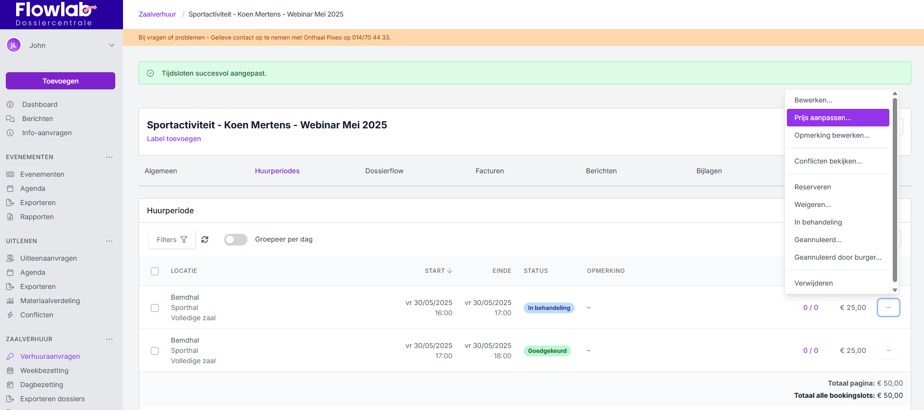 - Is het tijdslot wel al goedgekeurd? Wijzig dan eerst de status naar In behandeling. Pas daarna de prijs aan en keur het tijdslot opnieuw goed.