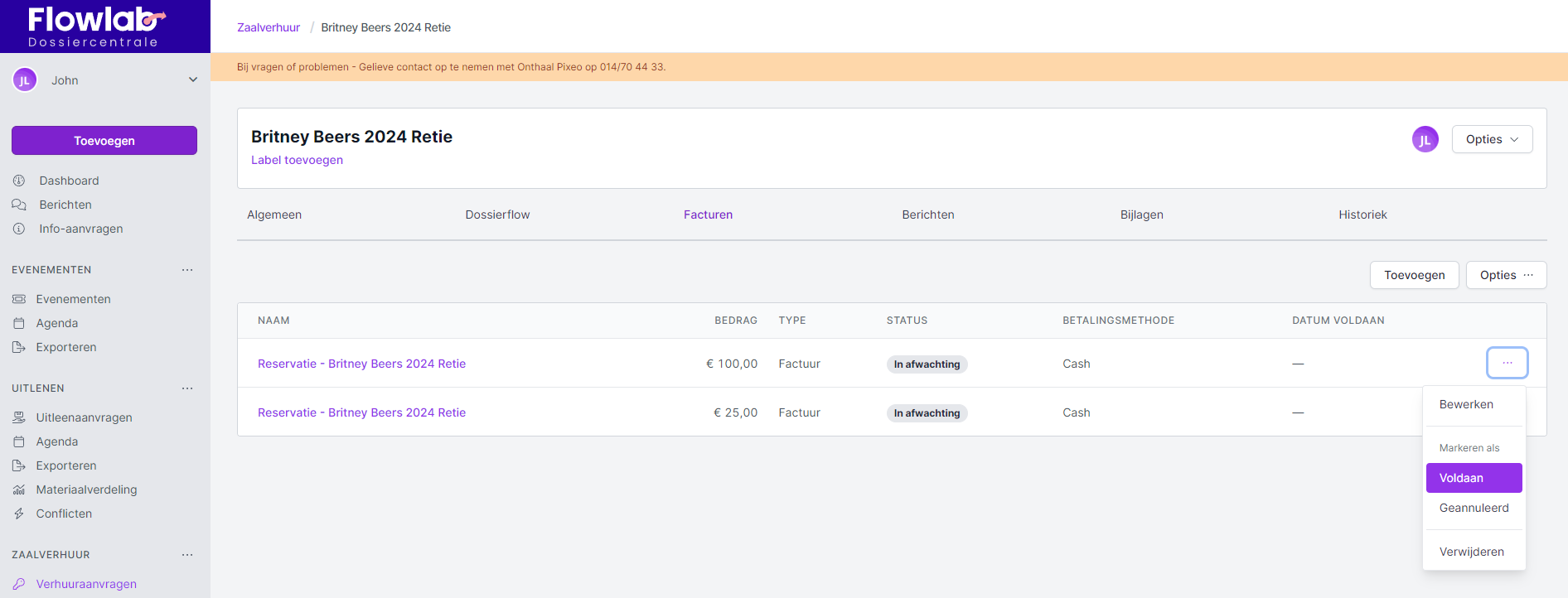 De status van een factuur bij de module zaalverhuur kan je op verschillende manieren aanpassen, zowel via de verhuuraanvraag zelf, als via de pagina Facturen onder de module Zaalverhuur.