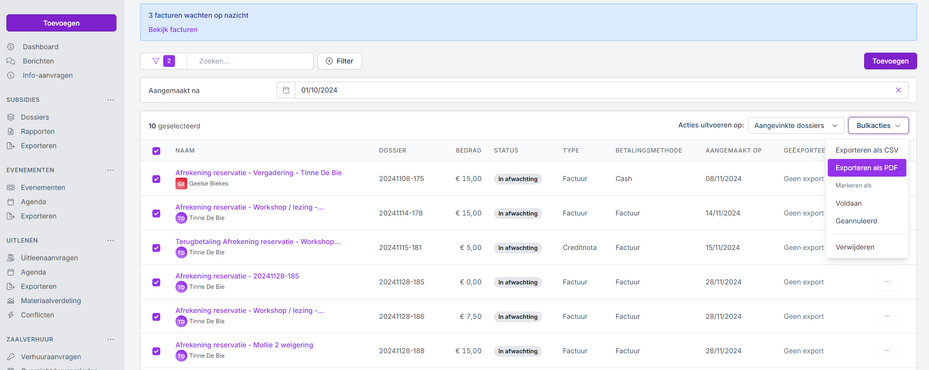 - Na de gewenste keuze voor acties uitvoeren op + bulkactie = exporteren als CSV/XML/PDF, wordt het bestand klaargezet in de downloadmap van je pc voor verdere verwerking en opvolging.