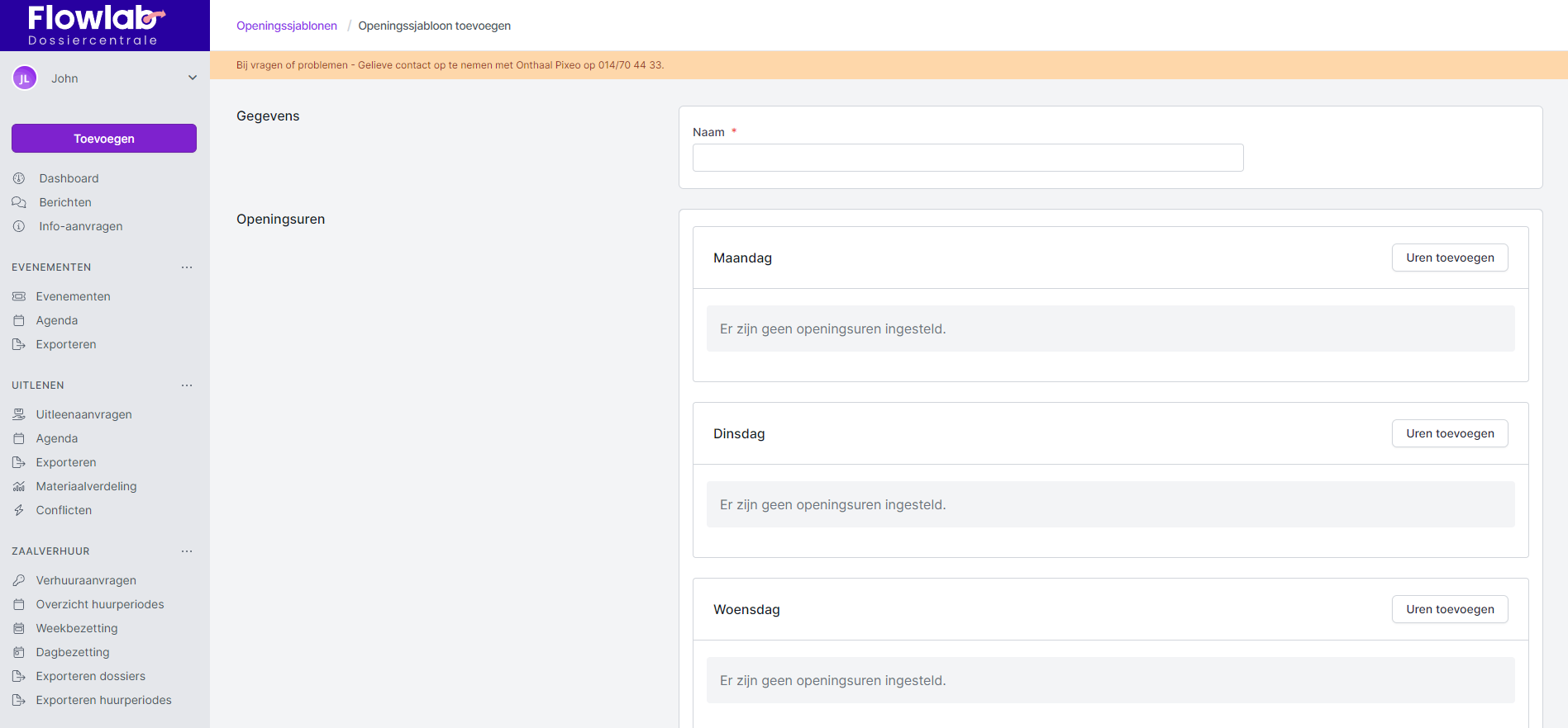 Wanneer verschillende locaties of verschillende ruimtes/zones binnen eenzelfde locatie dezelfde openingsuren hebben, kan je hiervoor een openingssjabloon opmaken. Zo moet je de uren slechts 1 keer invullen en kan je deze voor de verschillende locaties of ruimtes gebruiken.