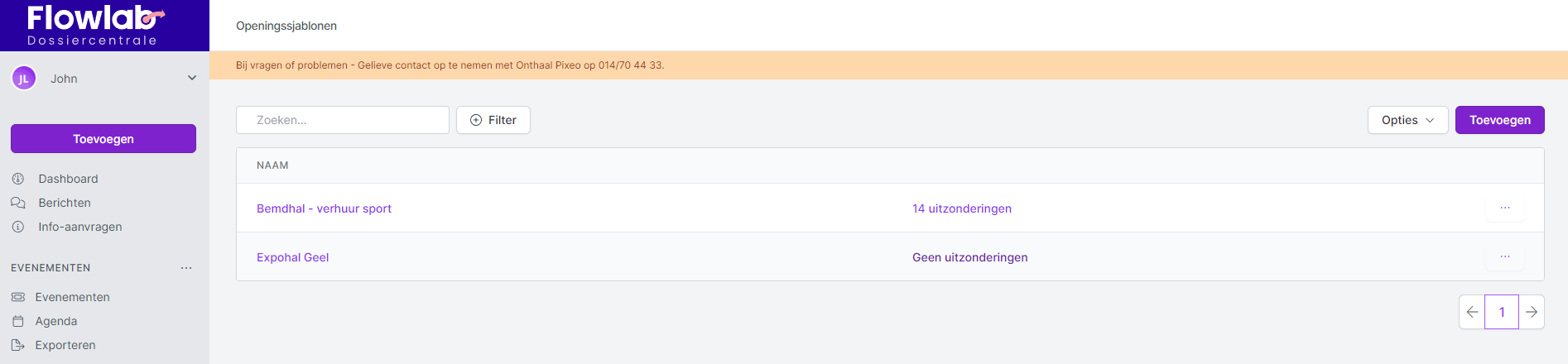 - Selecteer de pagina Openingssjablonen onder de module Zaalverhuur.