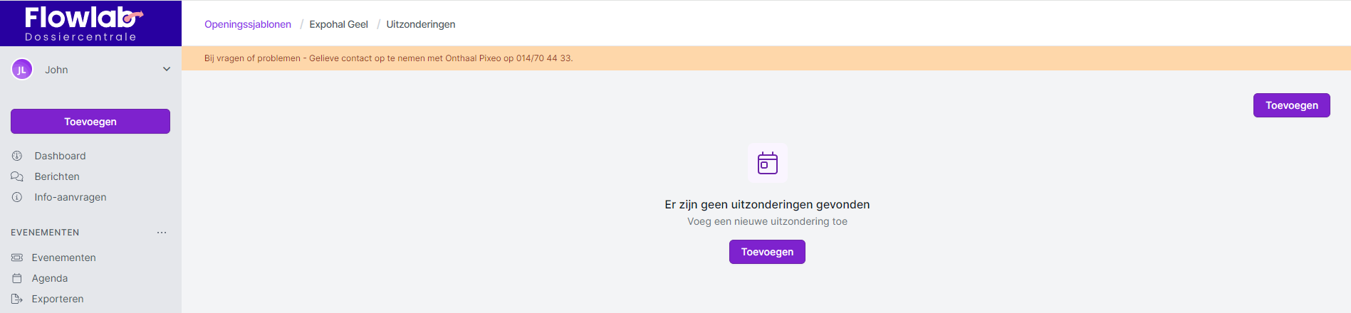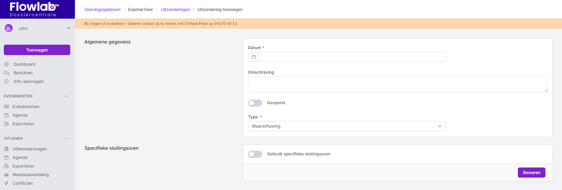 Nadat je het openingssjabloon hebt ingesteld, kan je hieraan ook uitzonderingen toevoegen zoals sluitingsdagen. Je kan zowel uitzonderingen toevoegen per openingssjabloon als voor alle (of enkele) sjablonen tesamen.