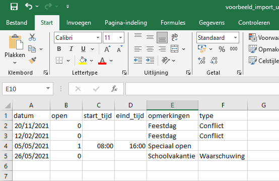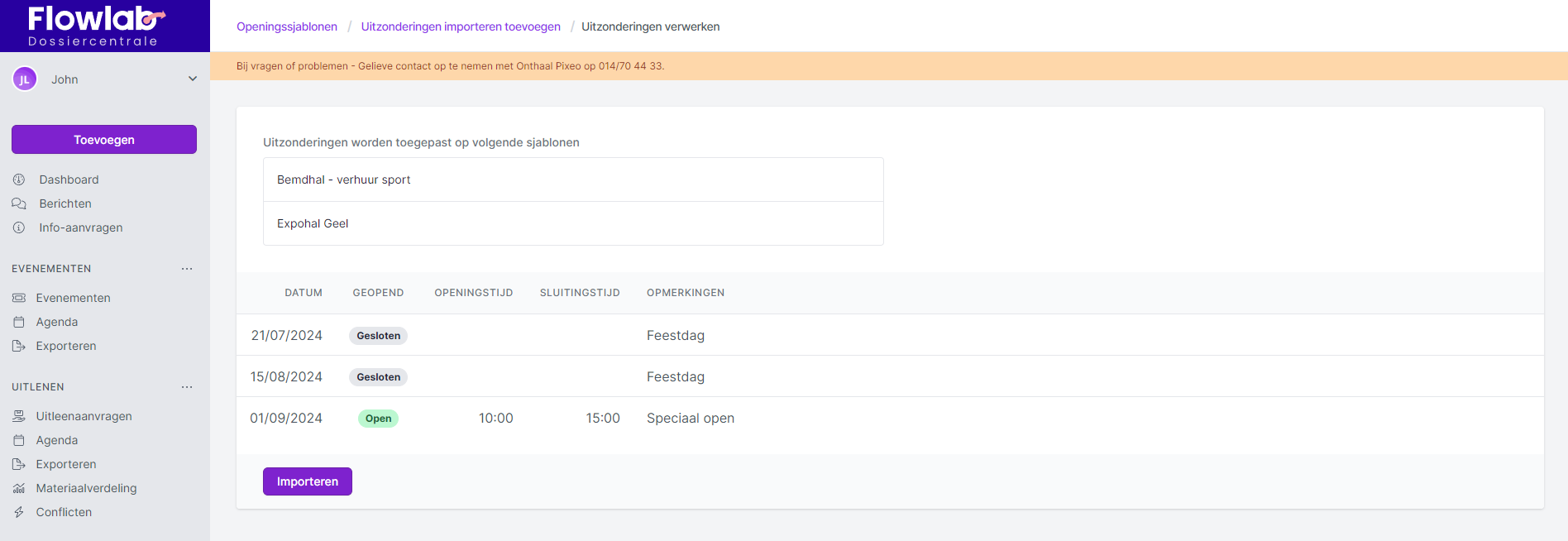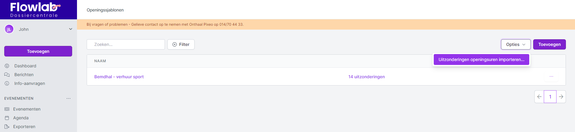 Nadat je een openingssjabloon instelde, kies je hiervoor, via Opties, uitzonderingen openingsuren importen.