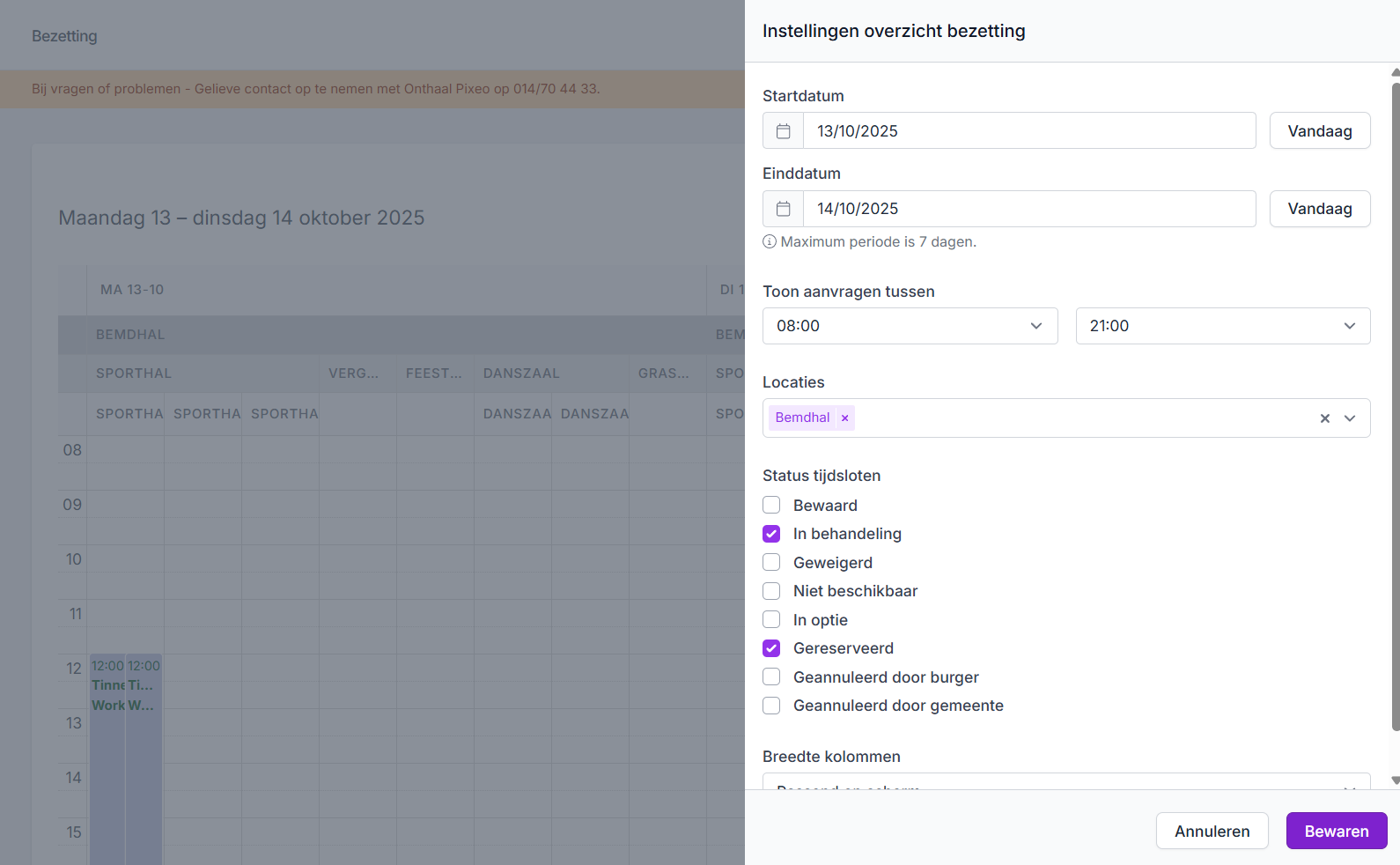 Via de pagina Bezetting onder de module Zaalverhuur kan je een overzicht opvragen van 1 of meerdere locaties per dag of per week, om zo de bezetting van de locatie te bekijken.