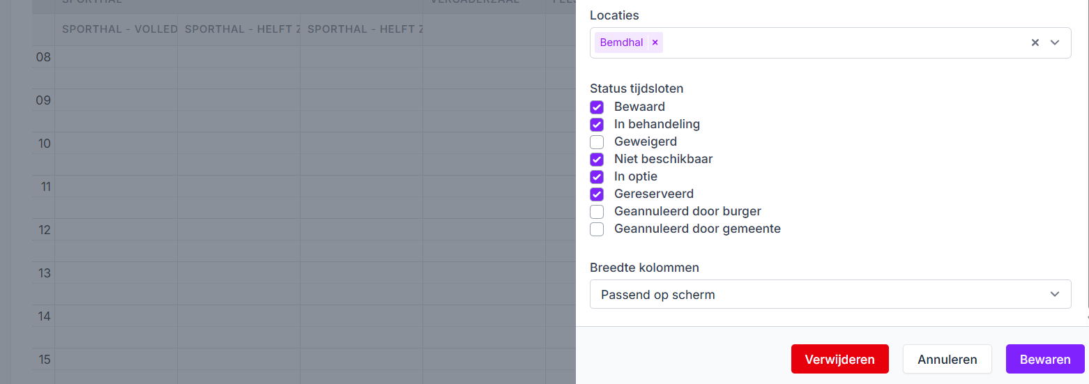 - Status tijdsloten: Bij Status tijdsloten kan je een filter instellen voor welke statussen je in het overzicht wil.
