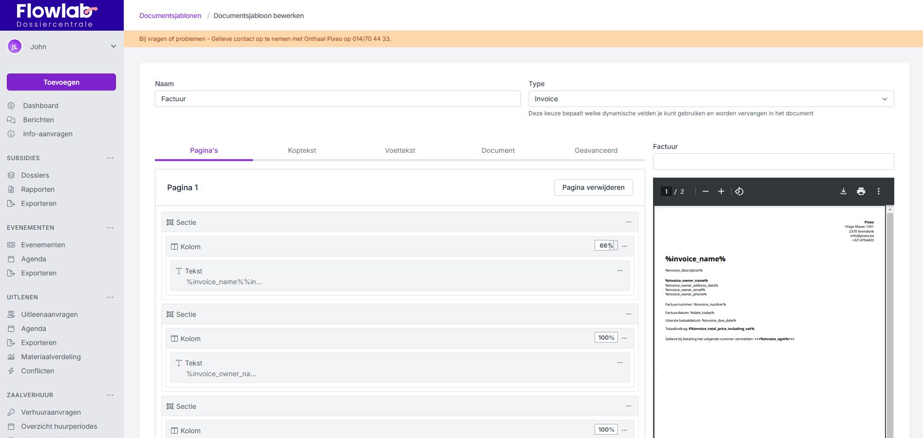 Zowel voor de module Zaalverhuur als voor de module Uitleen kan je PDF facturen genereren vanuit Flowlab, om deze daarna naar de aanvrager te versturen.