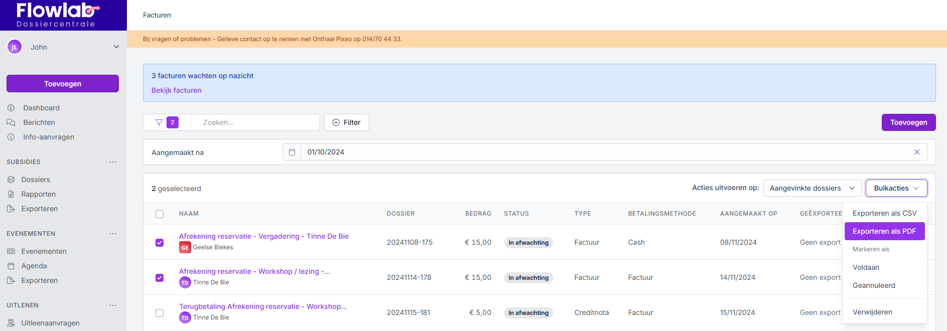 Wil je facturen exporteren voor zaalverhuur, kies dan voor Facturen onder Zaalverhuur. Wil je facturen exporteren voor de uitleenmodule, kies dan voor Facturen onder Uitlenen.