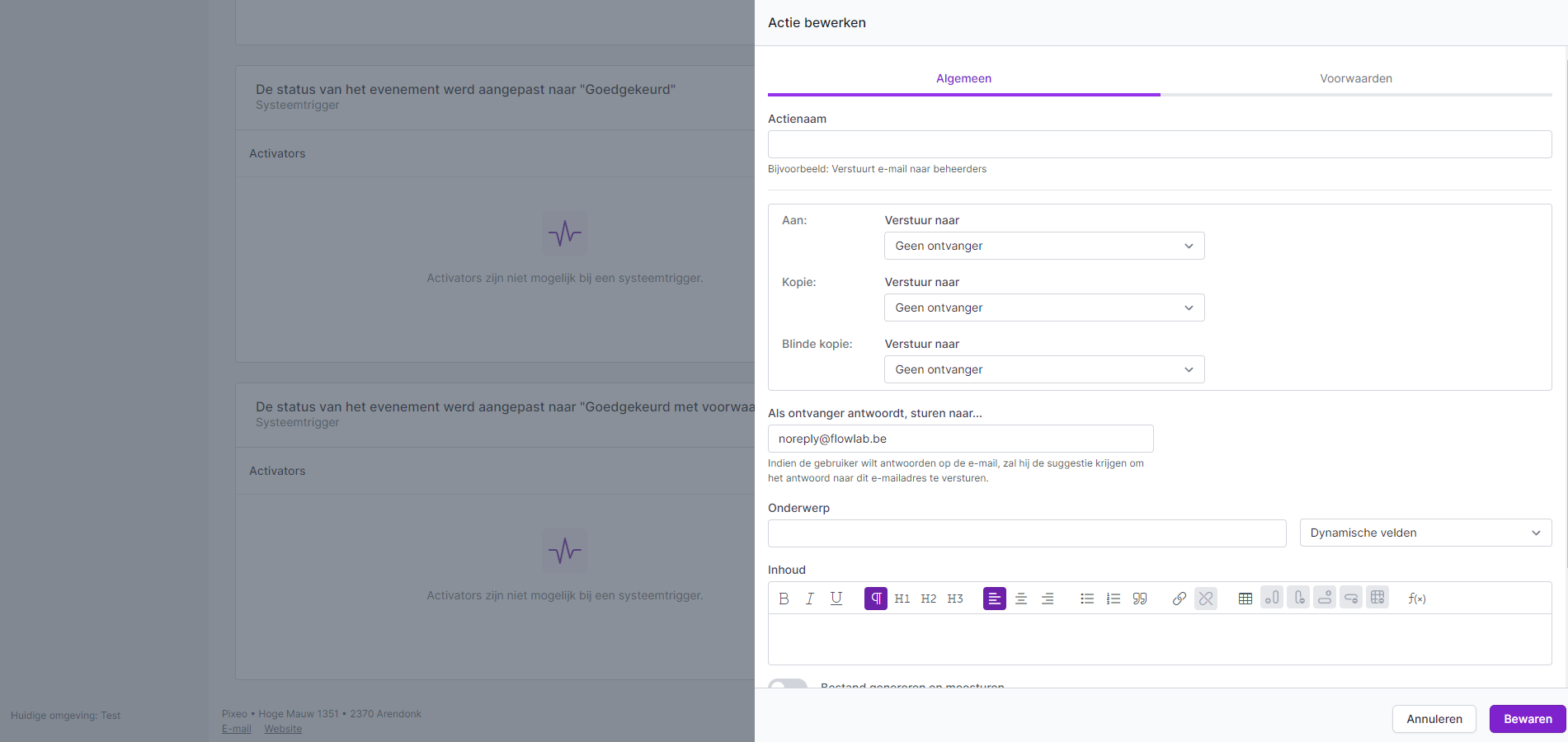 Vanuit Flowlab worden er verschillende automatische mails verstuurd, welke ingesteld en opgemaakt worden via Triggers en acties.